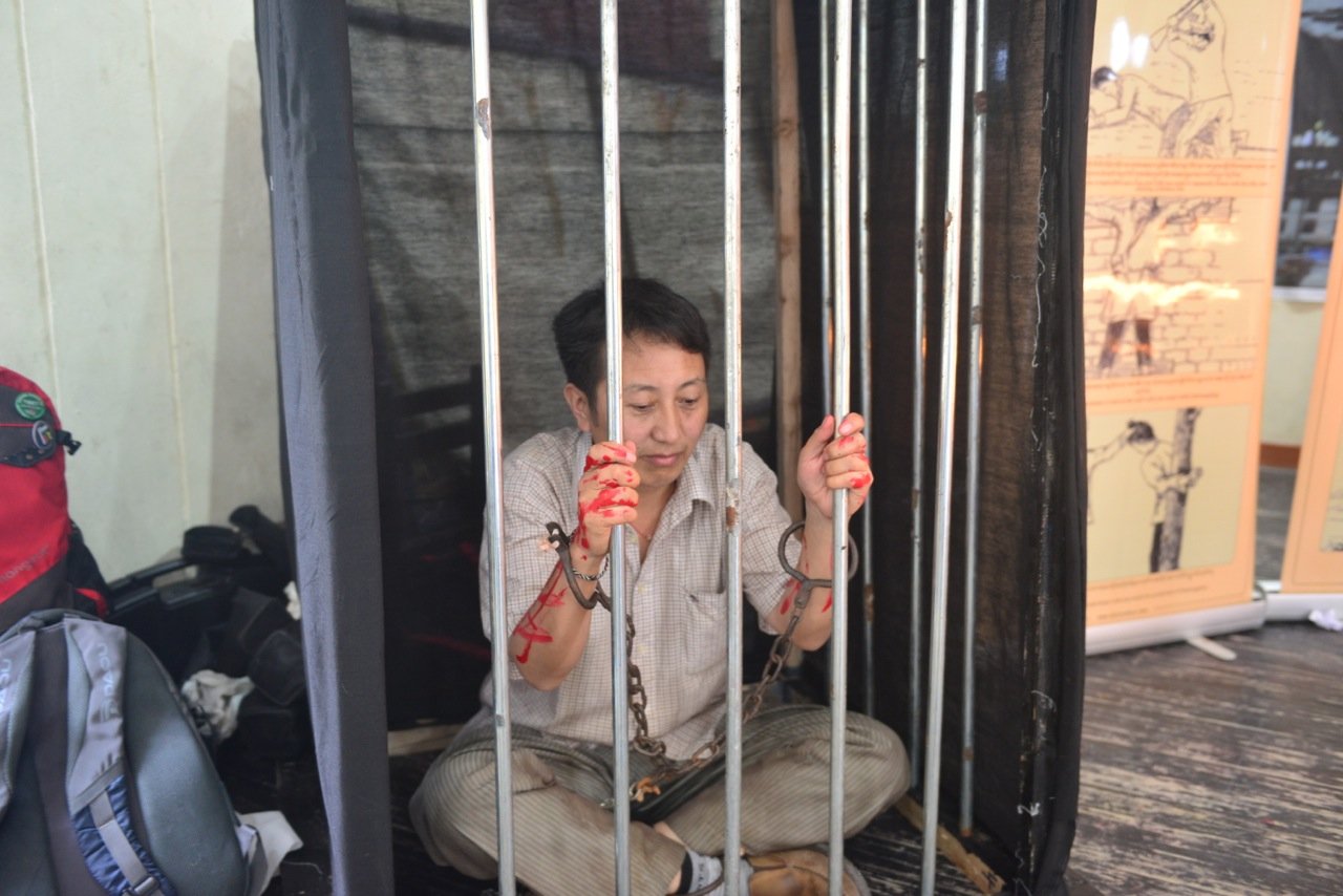 もう1つのセミナーでは会場になったニマロプタ・ホールの壇上正面にはこれまでの焼身者119名の顔写真が掲げられ、その前に多くの灯明が灯されていた。その右手には拷問道具の写真と共に、グチュスンのメンバーが実際に縄や鉄の鎖で縛られていた。左手には拷問シーンを描写した絵と共に、同じくメンバーが独房の中で繋がれていた。