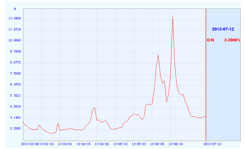日本メディアを眺めていると、「シャドーバンキングで中国バブル崩壊か!」的な見だしをあちらこちらで見かける。中国経済は明日にも崩壊しそうな盛り上がりである。記事「中国で短期金利が異常急騰、それでも中国政府が動かない理由とは」で取り上げた6月20日の上海インターバンク市場の金利急騰を引き金に、中国経済に対する懸念が高まったことに由来する。もっとも上海インターバンク市場の金利はその後急落し、3%代前半という平常値に復帰している。