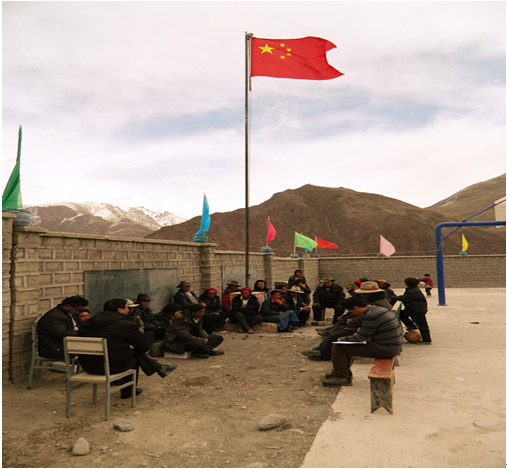 チャムド地区の駐寺工作組は2011年末、チベット自治区の「9有」政策(中国の歴代指導者4人の肖像画と国旗、道路、水、電気、テレビ、映画、書店、新聞を僧院に普及させる政策)を貫徹するため、500近い僧院の仏殿と各僧坊の屋上に五星紅旗を高く掲げるよう求めた。駐村工作組も農牧民の自宅屋上に五星紅旗の掲揚を求めた。僧院の全ての仏殿と僧坊、農牧民の家庭では、中国共産党の指導者のポスターを飾り、カタ(儀礼・贈答用のスカーフ)をささげる必要がある。