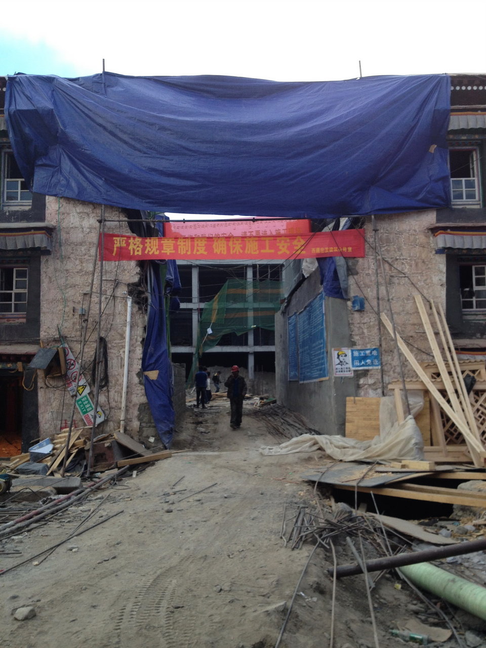 写真は「清政府駐蔵大臣衙門旧跡」に改装中のトムシカン。写真に写っている赤い横断幕のスローガンから、トムシカンを「修復」しているのは「チベット宏発建築公司」だと分かる。2013年5月に現地のチベット人が撮影した。
