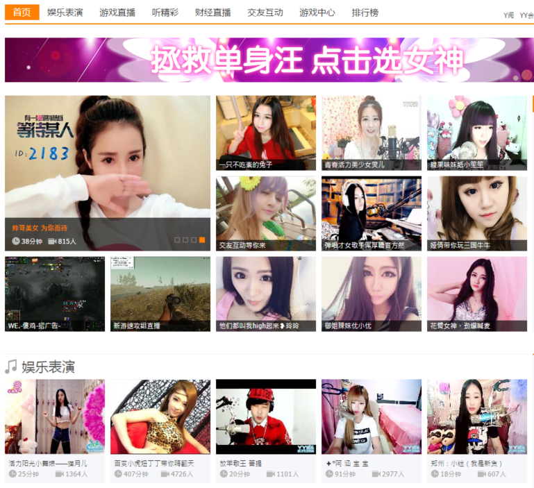 最大手YY娯楽は音声チャットアプリ・YYなどをリリースしていたBBINが2012年にリリース。後に大手ポータルサイト・網易が類似サービス・BOBO娯楽をリリースした。放送者は主に一般ユーザーで、ゲーム実況、そしてかわいい女の子によるカラオケやトークがメイン。バラエティ番組風の「録音笑い」を流せる機能が面白い。人気トップ級の放送は数十万人が視聴し年収は15万ドルに達するとの報道も(フォーリンポリシー・レコードチャイナ)。デジタルギフトは数円のビールから欧州旅行やMV撮影など10万元(約200万円)というクレイジーな一品まで用意されているという。ギフトを放送者だけではなく視聴者もレベルアップし、一目で「太客」だと分かるようになり、放送者におもねってもらえる。番組一覧を眺めると、顔が異常に細く目が異常にでかい女子が大量にいて、今中国ではこんなビジュアルが人気なの?!と不安になったり。