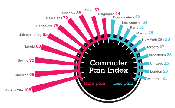 IBMは世界20都市で通勤に車を利用する8000人を対象とし、運転の長さや渋滞時間、ストレス度などの結果を「通勤苦痛指数」として数値化。8日公表した結果は、メキシコ市が108で、モントリオールは21だった。